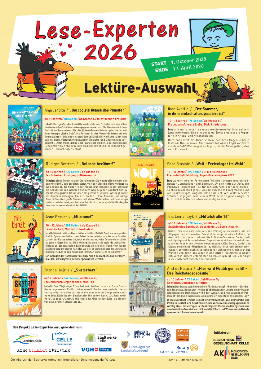 Für das alle zwei Jahre stattfindende Leseförderungsprojekt der Bibliotheksgesellschaft Celle schließen sich lokale Sponsoren, weiterführende Schulen und öffentliche Bibliotheken aus Stadt und Landkreis zusammen. Die Vergabe der Halbjahreszeugnisse an den Schulen markiert zeitgleich die Halbzeit für die Lese-Experten.